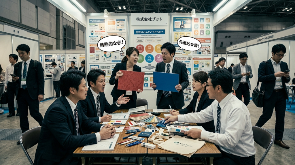 • 「ブースの壁紙は情熱的な赤がいい!」「いや、先進的な青だ!」